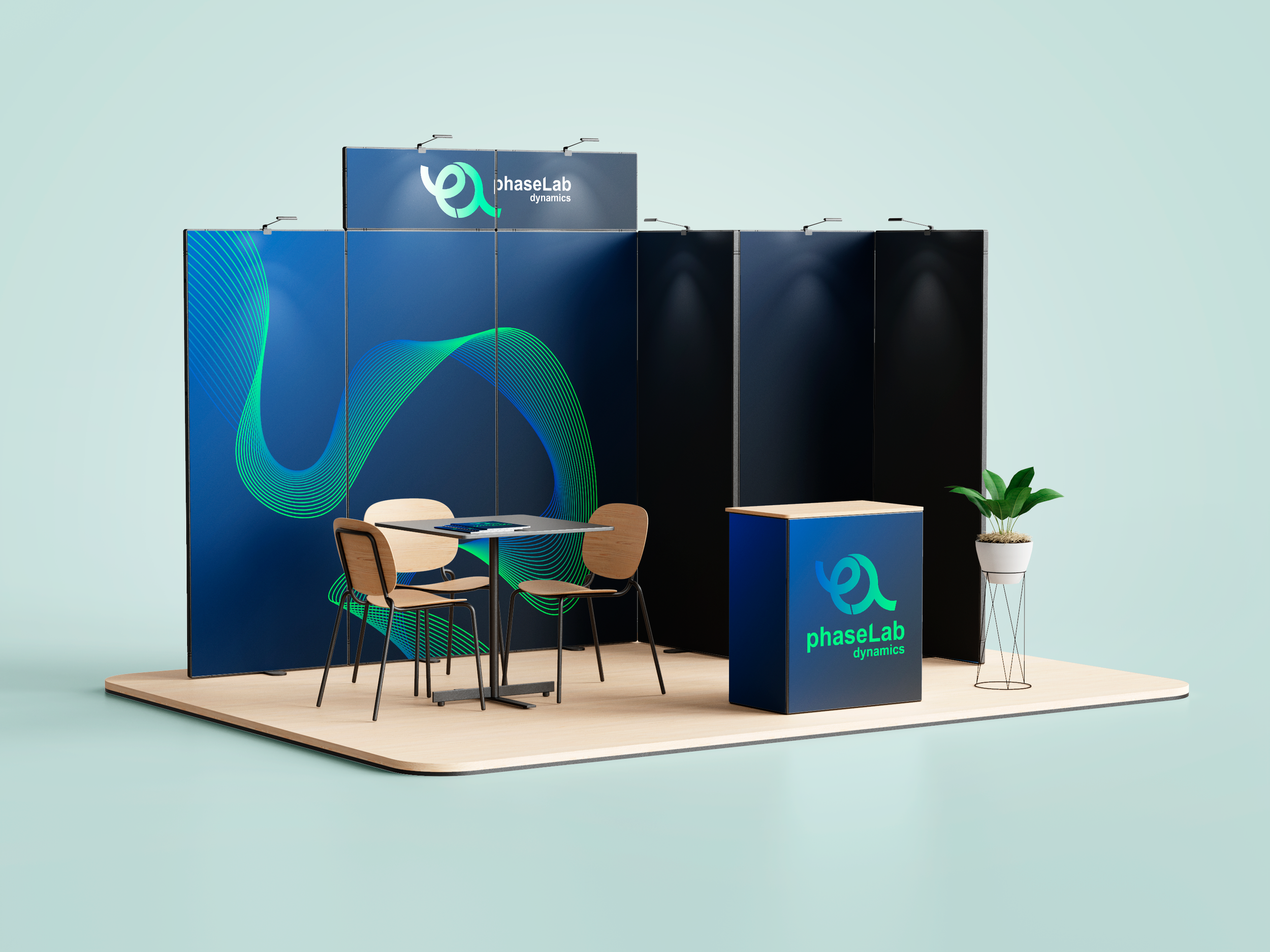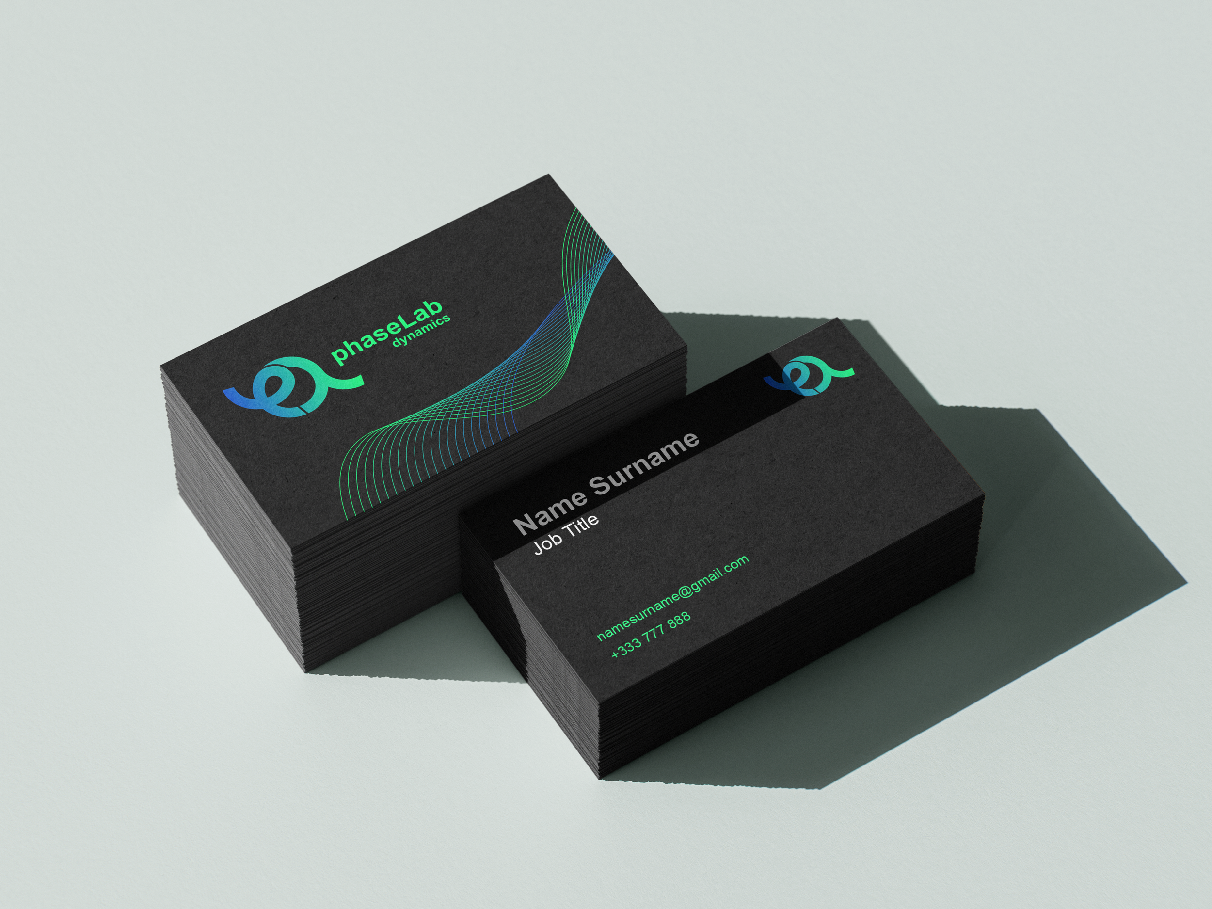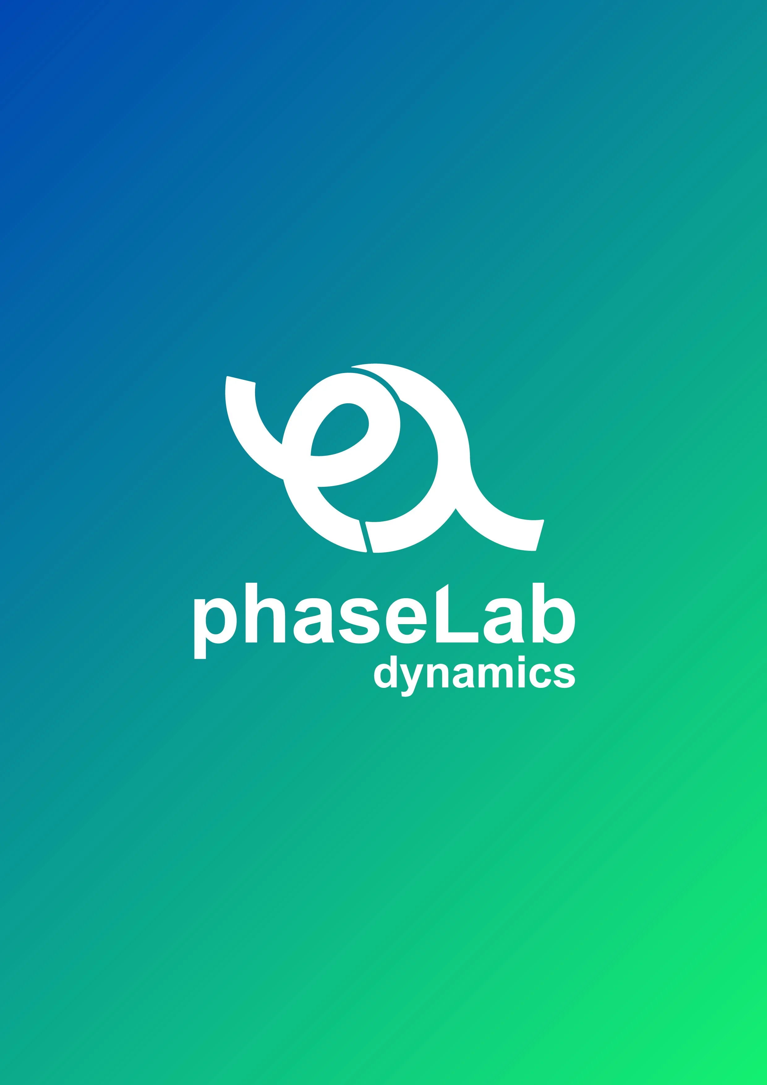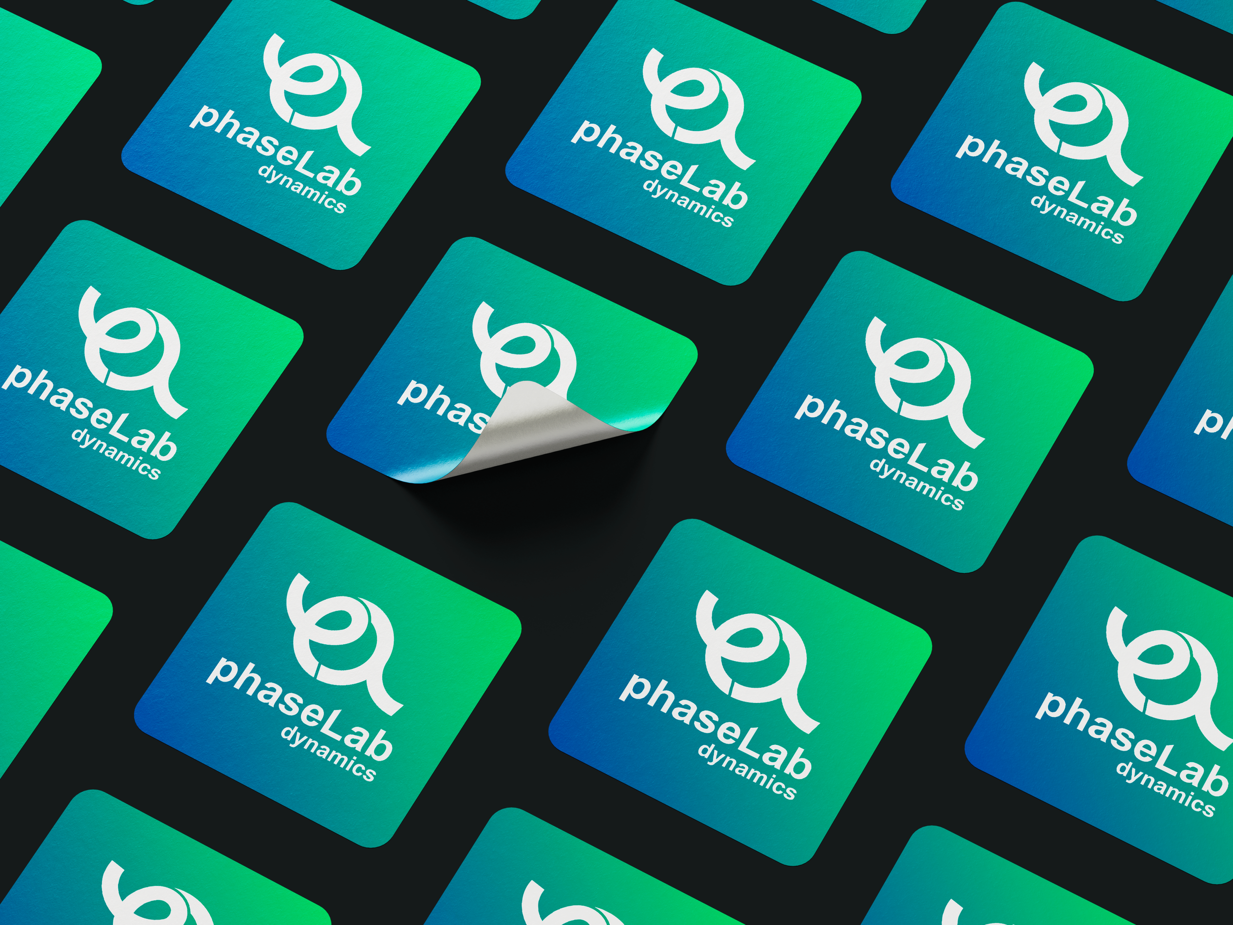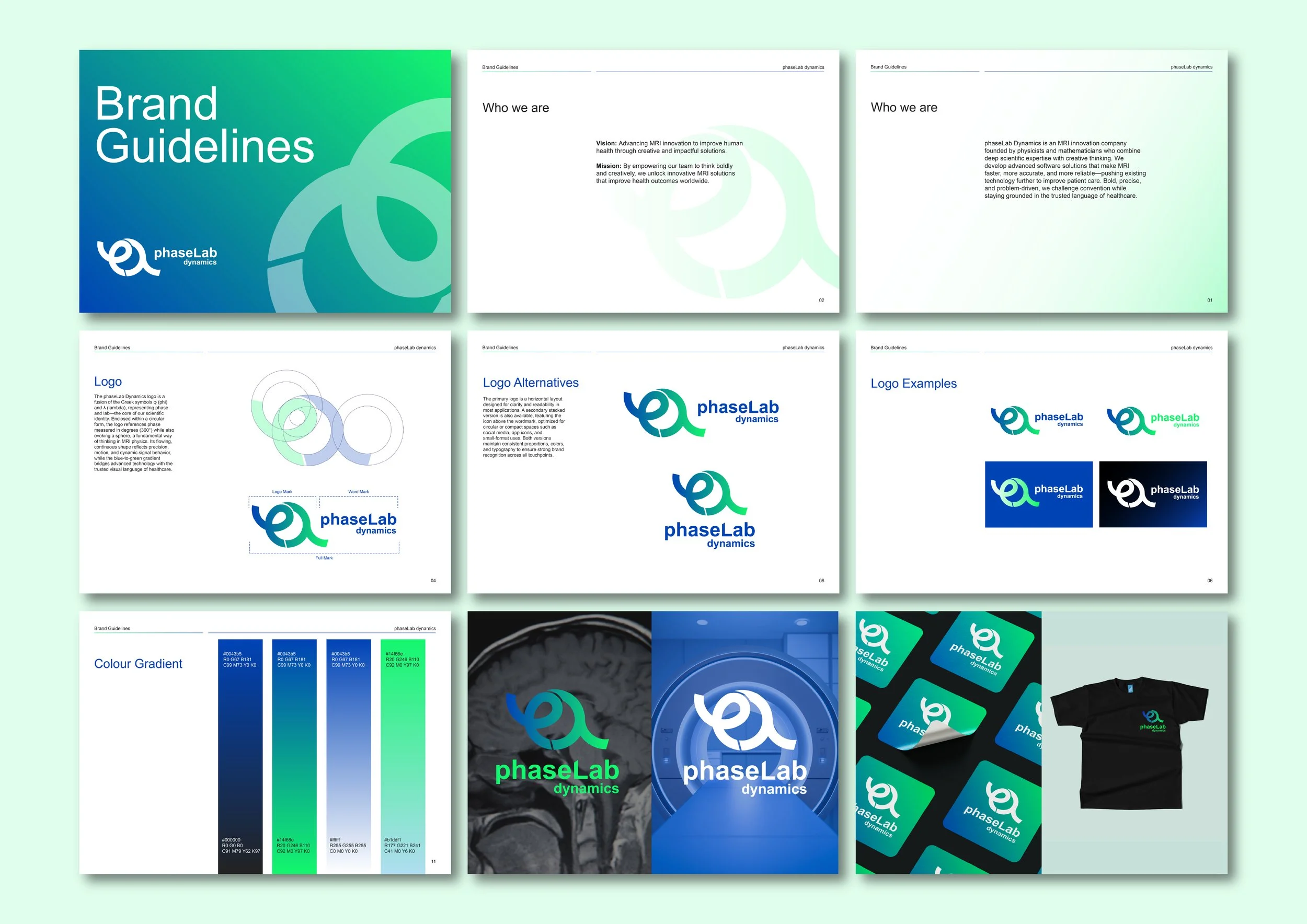 This branding project for phaseLab Dynamics translates complex MRI physics into a bold, circular identity—merging the symbols φ and λ to express precision, motion, and innovation, while a neon blue-to-green palette bridges advanced scientific thinking with the trusted visual language of healthcare.